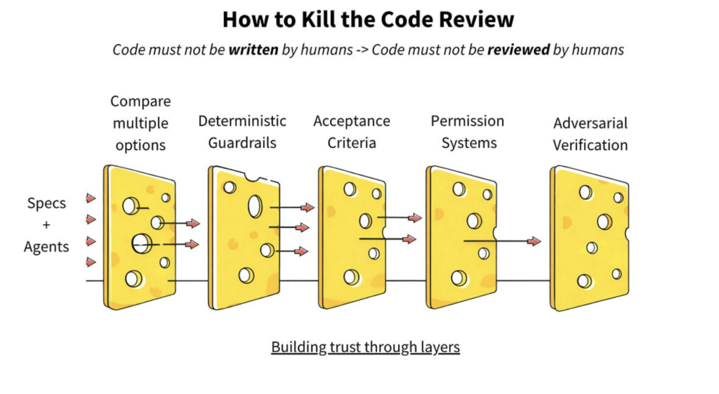If we can’t read all the code and at the current pace of production, we can’t we need a layered system where no single hole causes a production outage. The Swiss cheese model: no filter is perfect, but stacked together they overlap so the holes stop lining up.